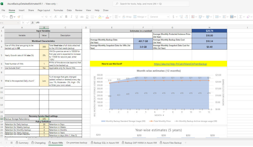 Bugün aslında size farklı bir Azure Backup maliyet hesaplama aracından bahsederek yazımı sonlandıracağım. Bu araç sayesinde maliyet optimizasyonu yapabilir ve yedekleme harcamalarınızı düşerebilirsiniz. Öncelikle bu araç çok iyi hazırlanmış bir excel dosyası ve adı Azure Backup Detailed Estimates. Bu Excel sayfası, ay sonunda Azure yedekleme maliyetlerinizi etkileyebilecek farklı parametrelere ince ayar yapmanıza olanak tanıyacak bilgiler sunacaktır. Aşağıdaki linkten bu araçı indirebilirsiniz.