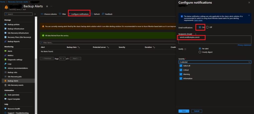 Azure Backup E-posta Bildirimlerinin Ayarlanması