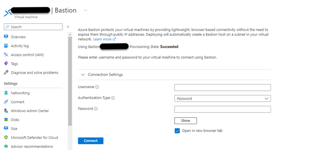 Bu ayarları yapmanıza rağmen halen Türkçe karakterleri kullanamıyorsanız bunun için Azure Portal’a login olun ve Bastion ile bağlanmak istediğiniz Azure Sanal Makineye gelin ve Bastion’a tıklayın.