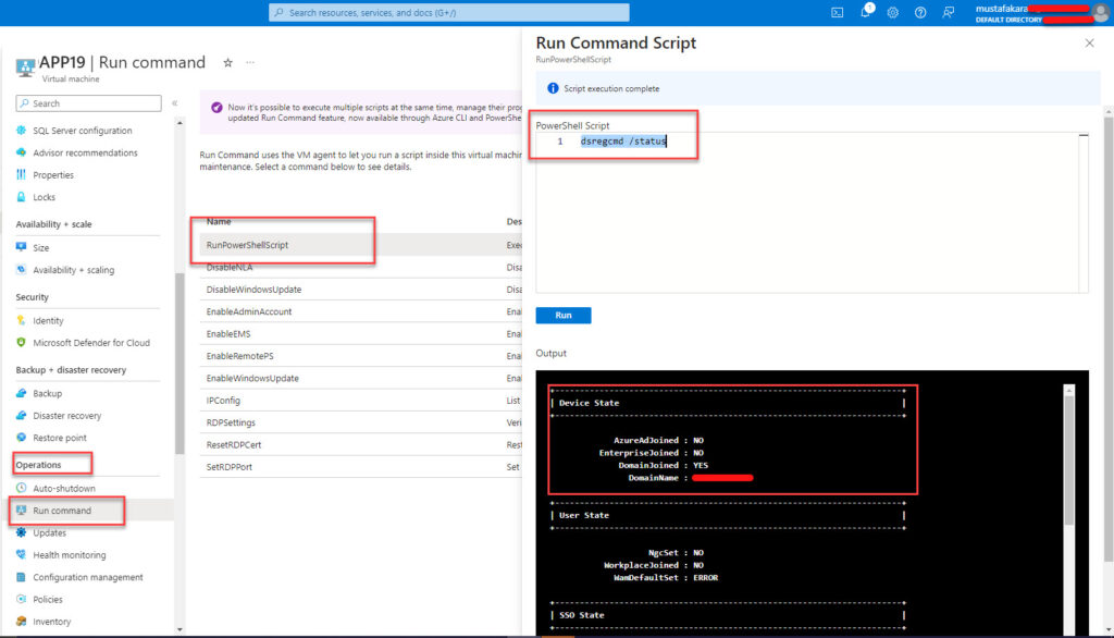 Azure Portal üzerinden bir sanal makinenin bir domain‘e katılıp katılmadığını öğrenmek mümkündür. Ancak bu bilgi doğrudan sanal makinenin genel özellikleri arasında gösterilmeyebilir. Ancak Azure Portal üzerinden en kolay yöntem bence Sanal makinenin üzerine geldiğinizde Operations bölümünde yer alan Run command kullanmaktır. Seçmiş olduğunuz sanal makinede RunPowerShellScript‘e tıklayıp dsregcmd /status komutunu çalıştırmanız yeterli.
