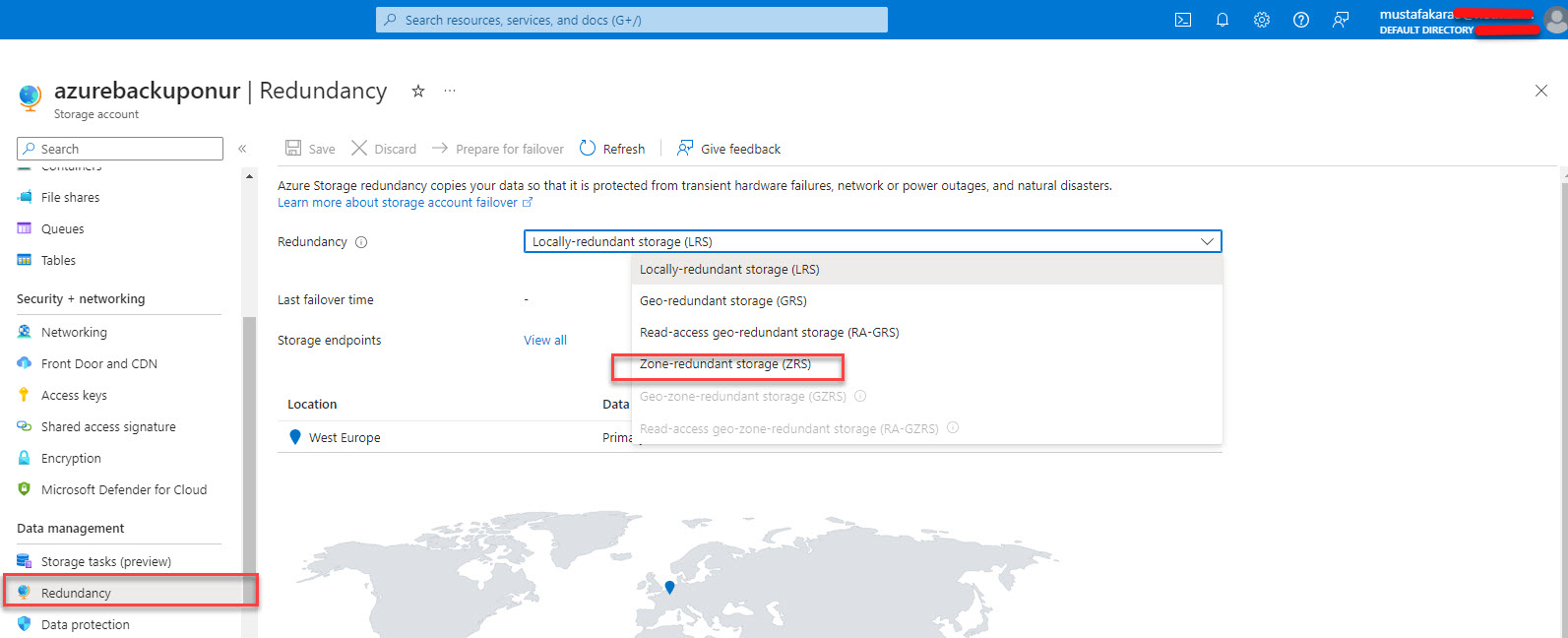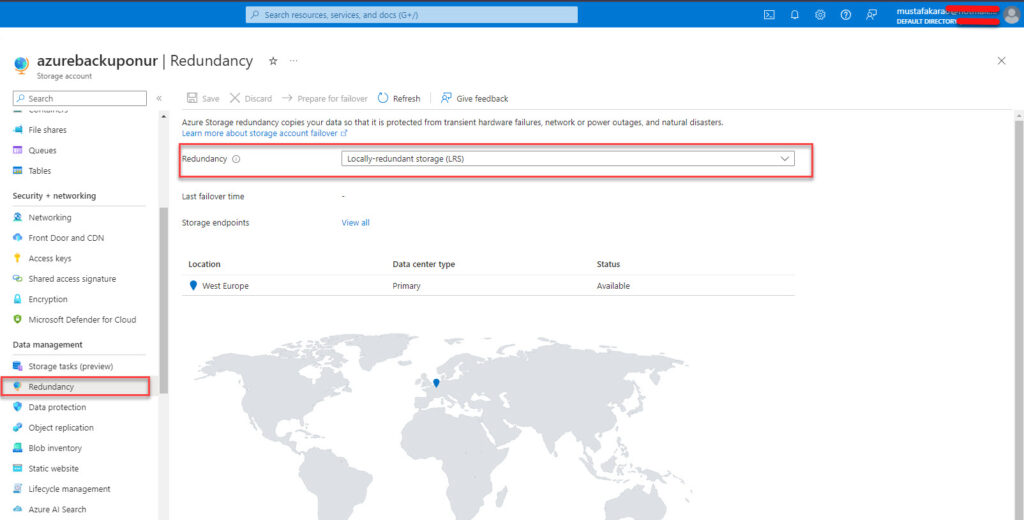 Bu bilgiler doğrultusunda replikasyon tipini değiştirmek için ilgili Azure storage account’una girin, sonrasında data management bölümün altında yer alan Redundancy’e gelin ve bu bölümde replikasyon tipini görebilirsiniz.