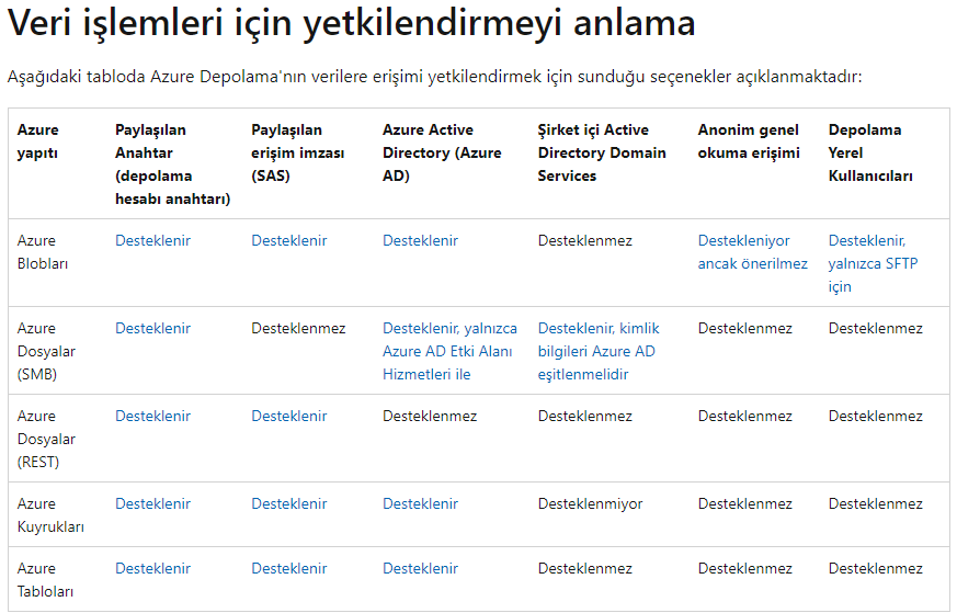 Azure Blob, Azure Queue ve Azure Table için Azure Active Directory servisini kullanarak Azure rol tabanlı erişim denetimi (Azure RBAC) aracılığıyla kimlik doğrulamasını ve yetkilendirme işlemlerini gerçekleştirebiliriz. Azure Dosyalar için SMB üzerinden yetkilendirmeyi Azure AD ile gerçekleştirebiliriz.