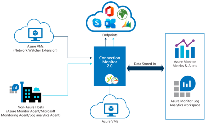 Ayrıca Connection Monitor 2.0, sanal makine ile uç nokta arasındaki kullanılabilirlik, gecikme ve ağ topolojisi değişikliklerini izler.Bir uç nokta ulaşılamaz hale gelirse Connection Monitor sizi bilgilendirir. Olası sorunlar, bir sanal makinenin işletim sistemindeki DNS adı çözümleme sorunları, CPU, bellek veya güvenlik duvarı olabilmektedir.