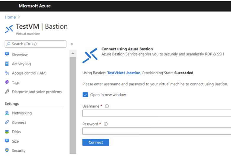 VM’nin bulunduğu sanal ağ için bir Azure Bastion kurduğunuzdan emin olun. Azure Bastion hizmeti sağlandıktan ve sanal ağınızda dağıtıldıktan sonra, sanal ağdaki herhangi bir VM’ye bağlanmak için artık kullanmaya başlayabilirsiniz.