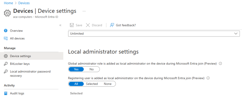 - Entra ID > Devices > Device Settings