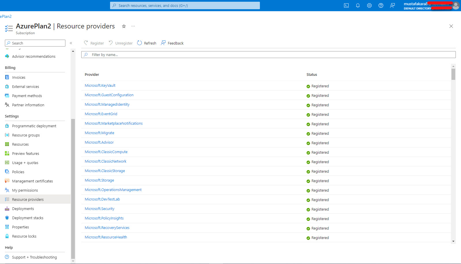 Öncelikle yapmanız gereken ilk adım Azure portalda subscription bölümüne gelin buradan Setting bölümünün altında yer altında Resource providers’a tıklayın.