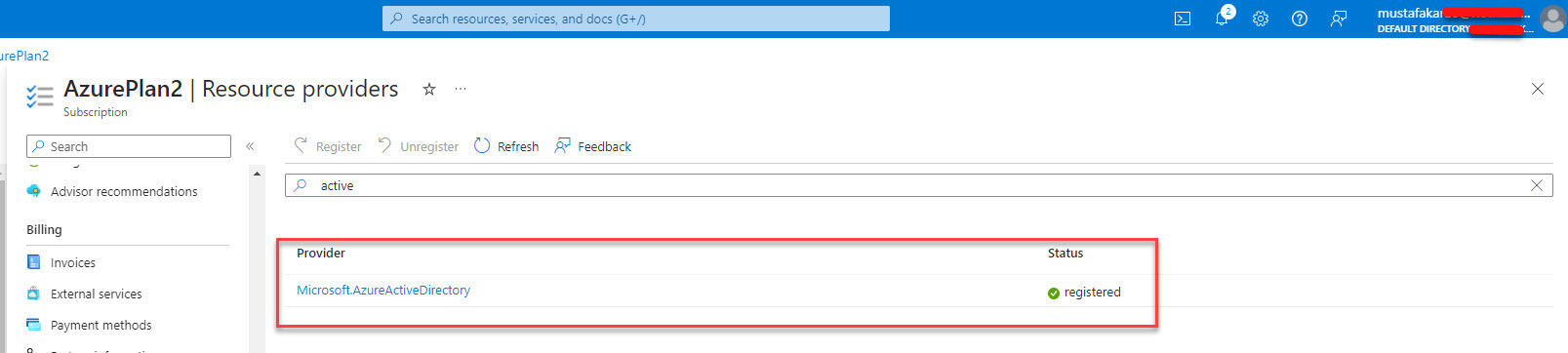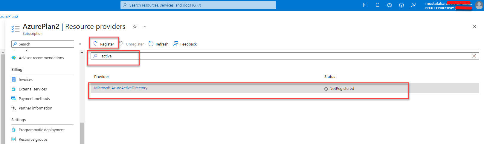 Arama bölümüne active yazmanız yeterli sonuçta Microsoft Azure Active Directory kaynağını arıyoruz, ekran görüntüsündeki gibi buldaysanız seçip, üst bölümde yer alan Register butonuna basın.