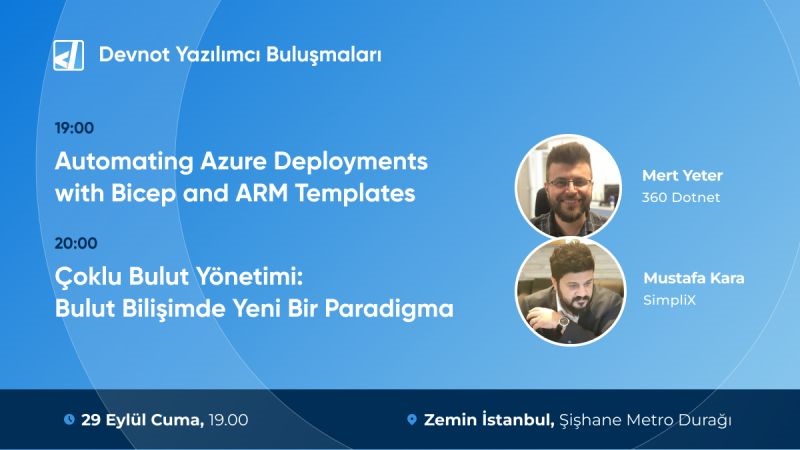 Mustafa, çoklu bulut yönetimi konusunda deneyimlerini paylaşacak. Mert ise Azure üzerinde Bicep ve ARM Templates kullanarak deployment’ları nasıl yönetebileceğimizi anlatacak. Bu değerli etkinliği kaçırmayın!