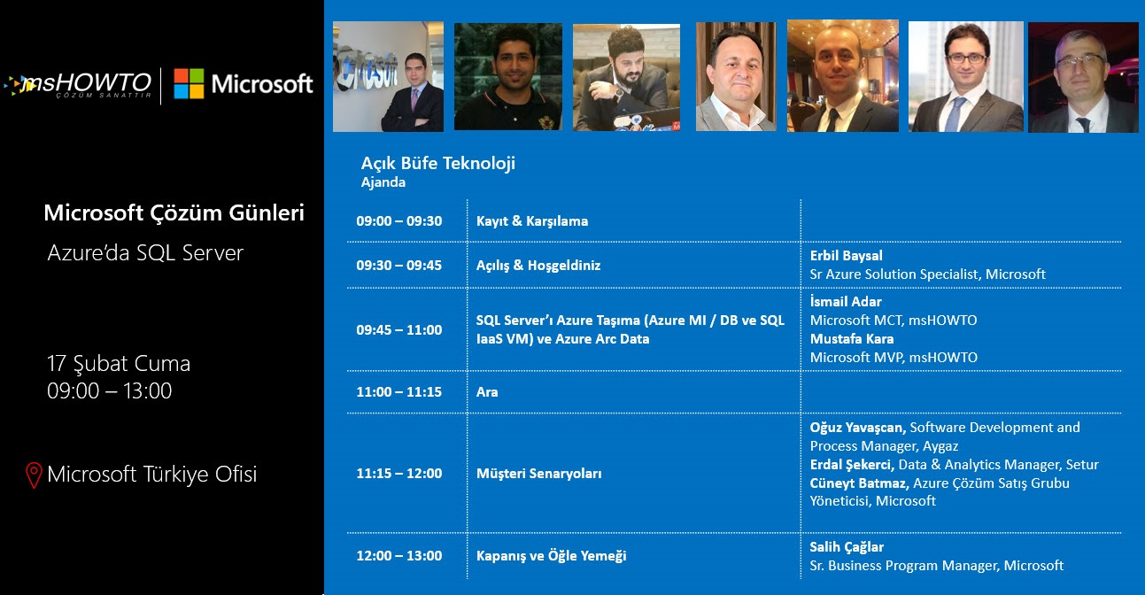 Mshowto Topluluğu ve çok değerli isimlerle birlikte Microsoft Türkiye ofisinde gerçekleşecek Açık Büfe Teknoloji etkinlik serisinin şubat ayındaki beşinci etkinliği SQL Server‘ı Azure’a taşıma senaryoları ve Azure Arc Data konuları ile devam ediyor.