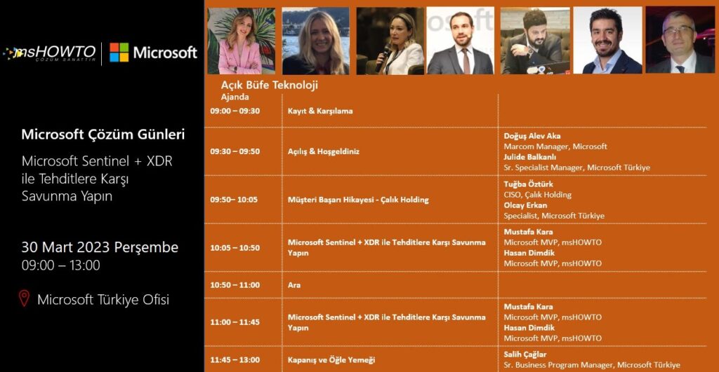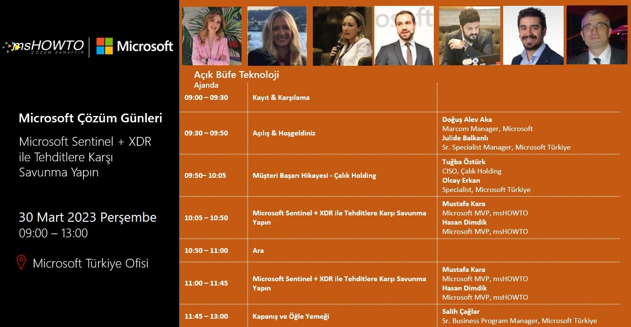 Okuma Süresi: < 1 dakikaMshowto Topluluğu ve çok değerli isimlerle birlikte Microsoft Türkiye ofisinde gerçekleştirdiğimiz Açık Büfe Teknoloji serisi etkinliklerine devam ediyoruz. Şubat ayının ilk etkinliğinde Microsoft Sentinel + XDR ile Tehditlere Karşı Savunma yöntemlerini konuşacağız.