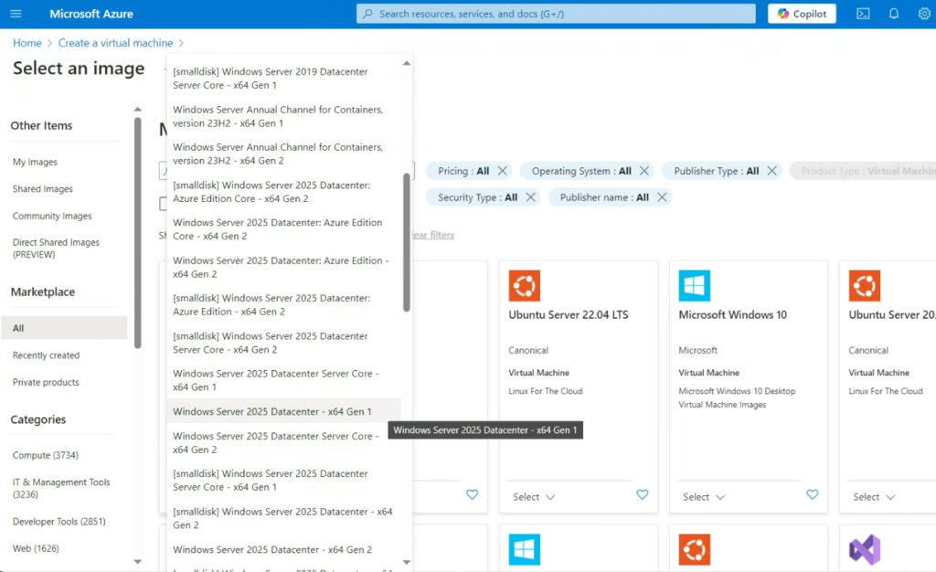 Windows Server 2025 işletim sistemini yukarıda Image kısmında seçili görüyorsunuz fakat Image kısmındaki pencereyi genişlettiğinizde Windows Server 2025 seçeneğini göremeyebilirsiniz. Bu sebep ile alt kısımda bulunan “See all images” seçeneğini seçip aşağıdaki ekrandan Windows Server 2025 üzerine gelip “Select” btunundan kurulum tipini belirleyebilirsiniz.
