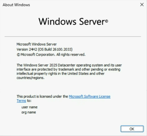 Tüm işlemler tamamlandıktan sonra farklı bir konfigürasyon yapmayacağımdan dolayı Review + create butonu ile makineyi deploy edebiliriz. Makinein kurulumu özelleştirdiğimiz donanım kaynaklarının kuvvetine bağlı olarak zaman alır. Makine deploy edildikten sonra hazırladığımız bilgiler ile makineye login olabiliriz. Aşağıda kurulumunu yaptığımız Windows Server 2025 sanal makinenin winver görüntüsünü görebilirsiniz.