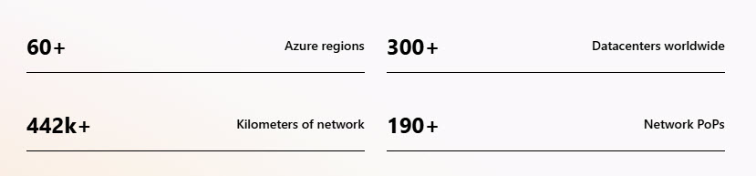 Microsoft Azure bölge sayısı şu an için 60’ın üzerinde, 300’den fazla veri merkezi, 450 bin KM ağ bağlantısı ve 190’nın üzerinde PoP sayısı bulunmaktadır.